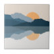 Abstract colourful illustration of sunrise with blue mountains reflected in the lake