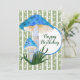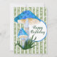 Pretty watercolor illustration of blue mushrooms on green and white aspen trees background with customisable Happy Birthday text.