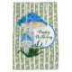 Pretty watercolor illustration of blue mushrooms on green and white aspen trees background with customisable Happy Birthday text.