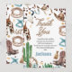 Boys blue and brown my first rodeo birthday that you card featuring a rope text heading, cowboy boots, rope, cowboy hat and more. This boy's 1st rodeo birthday thank you card is an ideal way to thank guests for coming to your little boy's wild west or rodeo themed first birthday party.