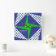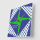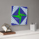A quilt block pattern in blue, green & white colours brings this old fashioned art form into the 21st century. This design is only suitable for the square clocks. Numbers mark the hours for 3, 6, 9, and 12 at each point of the star.
