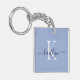 This modern keychain with your first name in a trendy script font in navy blue and your first initial in a modern cap font in white on light blue is perfect for your keys.