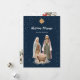 Beautiful blue Christian Christmas card featuring a scene with Mary, Joseph and the infant Jesus Christ in the manger in Bethlehem on the front and a watercolor painting of poinsettia, holly and red berries at the back.