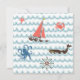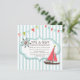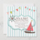 Illustration of a sailboat, helm, anchor and a party banner on a blue and white stripes. Fun and unique baby shower invitation.