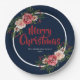 Elegant Christmas paper plates design featuring watercolor winter florals and navy blue background.