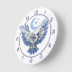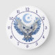 This unique and mystical clock features a blue owl with outstretched, pattern image wings. His penetrating eyes look straight ahead and claws are outstretched. In the distance, behind and above him, is a crescent mood and silvery blue stars. Dark blue numbers make the clock easy to read, and a thin matching blue circle frame separates the inside bird and moon images from the numbers on the circular border. Everything stands out on a crisp white background.
