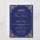Navy Blue Islamic Nikah Ceremony Invitation for Muslim couples. This card has an elegant vintage decoration in the corner of the border that is in gold colour. There are two script fonts shown. All the information on this product is editable. You can customise the card background and the colour and type of the fonts as well by using Zazzle's easy-to-use menu. A blank white envelope is also included.