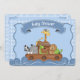 Blue Noah's Ark Baby Shower Invitation for Boys. Design has a light blue plaid background, an ark full of animals, and a banner with the words baby shower.