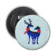 Bottle opener with a light green and white snowy looking background. Illustrated with a pair of blue scandinavian deer wearing red scarves. With decorative markings on their bodies.