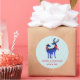 Personalised Christmas stickers with a light greenish blue background. Illustrated with a pair of blue scandinavian deer wearing red scarves. With decorative markings on their bodies.