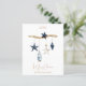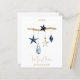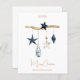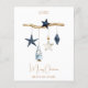 White background, brown wood, and blue and white Christmas decor. Blue and white stars, and a blue gnome woman. Merry Christmas written with a trendy handlettered style script.