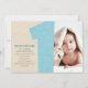 This first birthday party invitation features a giant number one in blue designed to look like kraft paper. Your little one's birthday party details are set to the left and their photo is displayed on the right.