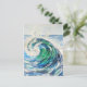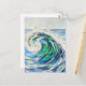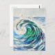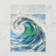 traditional watercolor and gouache painting of a foamy blue and turquoise coloured wave somewhere in the ocean on a postcard