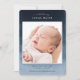 Elegant modern watercolor bohemian style birth announcement design with abstract blue and navy blue tone detailing. Script introducing line, and modern clean sans serif typography fonts. Space on the front for a large single photo along with birth statistics including birth date and time, as well as a baby's weight, length, and short line with parents' names. Back side features two additional photo spaces.