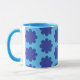 My original digital art on this mug features a pattern of blue retro style flowers on an aqua blue background for an artsy style. The inside of the mug and the handle are in an aqua blue tone to complement the artwork. The colours and pattern have a vintage vibe for a classic touch.
