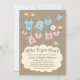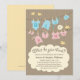 Customise this cute fun blue or pink gender reveal party invitation featuring lovely boy's and girl's apparel with text on them hanging from a clothesline. This design is on a nice warm brown background.