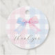 Decorate your baby shower favours with this round “Blue or Pink?” gender reveal tag, featuring a classic gingham bow pattern for a charming finishing touch.
