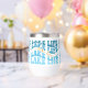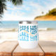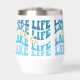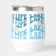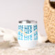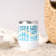 This wine glass tumbler is perfect for a lake cabin or boat enthusiast. The blue text "LAKE LIFE" is repeated in varying shades of blue, with orange script at the centre that also says "lake life". The pattern is repeated around the perimeter of the tumbler, and is placed on a white background.