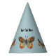 This paper party hat is light blue with three pretty monarch butterflies who are blue and orange. Customise your text with the template.