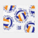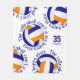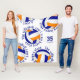 This fun volleyball themed fleece blanket features 5 randomly arranged blue, orange and white volleyballs with the text, "The volleyball court is my happy place" in orange encircling each volleyball in a cool typographic font, all on a white background - her name and jersey number are customisable - by katz_d_zynes