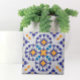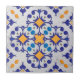 Vibrant decorative tile design featuring blue and orange Portuguese azulejo motifs on a white marble background.