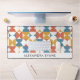 Elevate your professional style with our mid-century modern retro desk mat featuring a captivating seventies or sixties vintage pattern. The suite showcases a unique design with half circle and scallop shapes in vibrant shades of blue, orange, and yellow. Personalise your workspace by adding your name to the designated line, creating a bespoke and distinguished look that is uniquely yours.