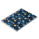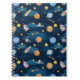 A whimsical and colorful seamless pattern featuring adorable watercolor illustrations of celestial objects on a dark blue night sky background with soft cloud effects. The design includes happy planets, rockets, a UFO, shooting stars, and asteroids, making it perfect for children's decor, apparel, fabric, accessories, and other print-on-demand items. This design is great for space lovers of all ages.