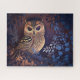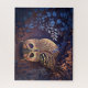This artwork depicts a blue owl on a branches in blue background, in the style of dark black and light amber, hand-colouring, colourful storytelling, screen printing, porcelain, vibrant use of light and shadow, fairy tale.