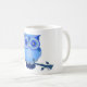 Mug has a blue monochromatic design of an owl on a branch with leaves.