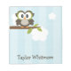 A cute brown and lime green owl sits perched on a leafy branch with a blue striped and white fluffy cloud background. This cute and kawaii cartoon wise owl custom notepad can be personalised with your name or whatever you'd like to say. Artwork © Chrissy H. Studios, LLC. All Rights Reserved.