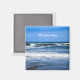 A square magnet with a photograph taken on the Oregon Coast of the beautiful blue Pacific Ocean, waves crashing on the sand and jagged rocks. Personalise by adding your name. Perfect for beach lovers.