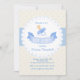 A sweet baby shower invitation with a cream background and tiny blue hearts overlaid with a scalloped decal featuring a blue pacifier and a ribbon with the words "baby shower".