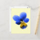 This postcard features a photograph of a wild Pansy flower. The photo has been artificially coloured resulting in a pansy with light and dark shades of blue and a pale yellow centre. The background is pale yellow to show off the beauty of this flower to the maximum.