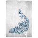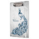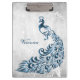 Jot down notes and reminders on a secure surface with a Blue Peacock Personalised Clipboard. Clipboard is a visually striking office item, featuring a vibrant metallic blue peacock with iridescent feathers shimmer with hues of sapphire blue, and cobalt, creating a bold and luxurious focal point. Set against a grey grunge background, adorning the design are delicate white leaf botanicals, intricately woven around the peacock. These leaves add a touch of elegance and nature-inspired softness, softening the grunge background’s roughness while complementing the peacock’s regal presence. Elegant script lets you add your name or recipients name for a personal gift.