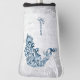 Protect your golf clubs with this unique Blue Peacock Personalised Golf Head Cover. Cover is a visually striking golf gift, featuring a vibrant metallic blue peacock with iridescent feathers shimmer with hues of sapphire blue, and cobalt, creating a bold and luxurious focal point. Set against a grey grunge background, adorning the design are delicate white leaf botanicals, intricately woven around the peacock. These leaves add a touch of elegance and nature-inspired softness, softening the grunge background’s roughness while complementing the peacock’s regal presence. Elegant script lets you add your name or recipients name for a personal gift.