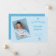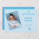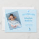 Boy's Blue Photo Newborn Baby Announcement Card. Card design has a photo that you replace with your own, plus cute a cute giraffe, baby's name, date of birth, and vital statics. The background is blue with white dots.