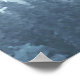 This wedding seating chart features a rustic yet elegant design with a blue forest of mountain spruce or pine trees shrouded in mist or fog. The title reads "please find your table" in elegant lacy script calligraphy. There is space for the couple's names and wedding date. This chart has table assignments for 300 guests in a traditional arrangement of 10 people per table. Perfect for a woodland, outdoor or wilderness destination wedding.