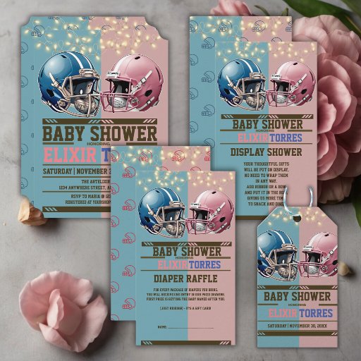 The "Blue & Pink American Football Helmet Baby Shower Collection" blends playful sports energy with a soft, gender-neutral colour scheme. Featuring blue and pink football helmets this collection strikes the perfect balance between fun and celebration, making it ideal for honouring the upcoming arrival of a little one in a spirited, yet charming way. If you need any other matching product or customisation, kindly message via Zazzle.