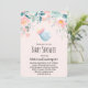Baby shower invitations with a cute image of a light blue baby bottle with a pink rim. A pink and green floral border adds a touch of femininity.