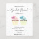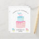 A cute budget gender reveal invitation. On the front the typography text reads The Couple's names, Gender Reveal, homemade with love. The Gender Reveal text is enclosed within a cake topper, on a cake made of two tiers in blue and pink. The homemade with love text is flanked by two cupcakes in blue and pink, on a background of blue and pink cake sprinkles. Personalise by adding your event details to the back.