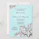 This 5x7 trendy wedding invite has a beautiful pink cherry blossom design on the bottom right and the top left. There is also a pink hummingbird silhouette towards the bottom. In the background, there is a soft aqua blue colour with a faint swirl design at the top and bottom. In the middle, you can easily customise your wedding information. This would be suitable for a spring or summer wedding!
