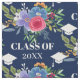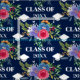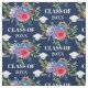 Pretty floral graduation fabric in blue with a white graduation caps surrounding a floral arrangement in pink, blue, purple, and orange. Personalise with the year in an elegant white font.