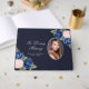 Easily personalise this beautiful blue and silver floral in loving memory/funeral guest book featuring a photo adorned with blue and pink roses and baby's breath flowers on a dark blue background.