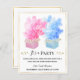 A budget baby shower or gender reveal invitation. On a white background the design consists of pink and blue surprise boxes, labelled miss and mister, with erupting elegant blue and pink smoke, and gold party decorations. The babies surname is written within the smoke in white typography text. The text reads it's a party, please join for a little miss or mister gender reveal. Personalise by adding your full event and contact details to the front and back.