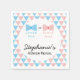 Blue and pink triangle pattern gender reveal with bow tie paper napkins. The design features a blue and pink triangles pattern and a white circle in the middle with a bow tie and your custom text.