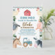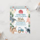 Cute farm themed boys birthday invitation featuring some farm animals, barn, tractor and a blue plaid pattern and foliage. Ideal for a boy's first, second or third birthday.