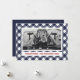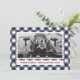 A modern and rustic holiday card featuring personalised photo on ablue and white flannel inspired background.
