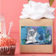 Original watercolor painting by Sandra Gale, featuring a blue point Siamese cat, surrounded by blue flowers on a pale purple background. Flowers are blue hydrangea, and blue poppies. Great design for cat lovers and those who especially like the Siamese breed. Perfect for bedroom wall art or framed with matching image. Matching watercolor painting of a chocolate point Siamese also available in my EverIrisPrints store.