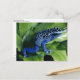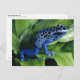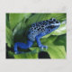 Animal card showing a colourful blue poison dart frog. The blue poison dart frog or blue poison arrow frog or known by its native name, okapipi, (Dentrobates tinctorius "azureus") is a poison dart frog found in the forests surrounded by the Sipaliwini savannah, which is located in southern Suriname and adjacent far northern Brazil. It is a medium-sized frog that weighs about 8 grams and grows to 3.0-4.5 cm in length. Females are larger and about half a centimetre longer than males, but males have larger toes. The frog has a typical lifespan of five to seven years in the wild. Its bright blue skin, usually darker around its limbs and stomach, serves as a warning to predators. The glands of poisonous alkaloids located in the skin serve as a defence mechanism to potential predators. These poisons paralyse and sometimes kill the predator. The black spots are unique to each frog, enabling individuals to be identified. This species of frog has a distinctive hunch-backed posture.