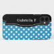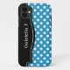 Stylish iPhone 5 case designed with a white polka dots over blue pattern, a black frame over the left side, and personalised with your name or custom text in white across the black frame. This design is perfect for vertical and horizontal use of the iPhone 5.